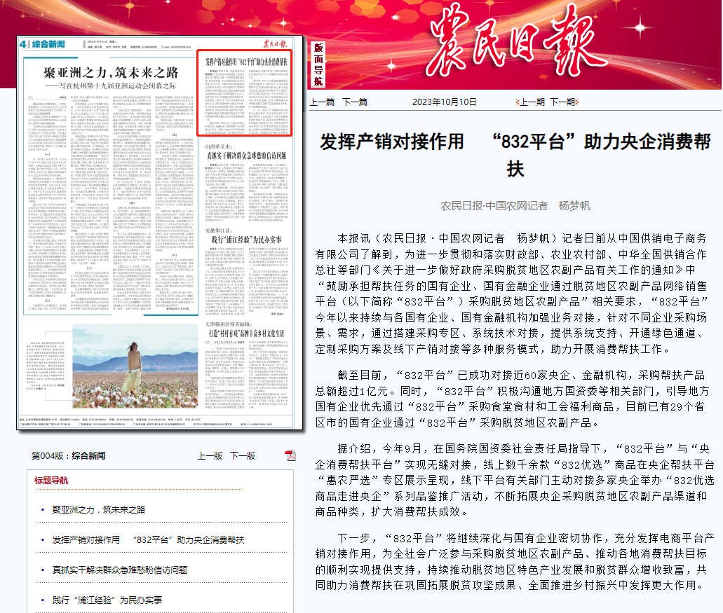 据介绍,今年9月,在国务院国资委社会责任局指导下,“832平台”与“央企消费帮扶平台”实现无缝对接,线上数千余款“832优选”商品在央企帮扶平台“惠农严选”专区展示呈现,线下平台有关部门主动对接多家央企举办“832优选商品走进央企”系列品鉴推广活动,不断拓展央企采购脱贫地区农副产品渠道和商品种类,扩大消费帮扶成效。