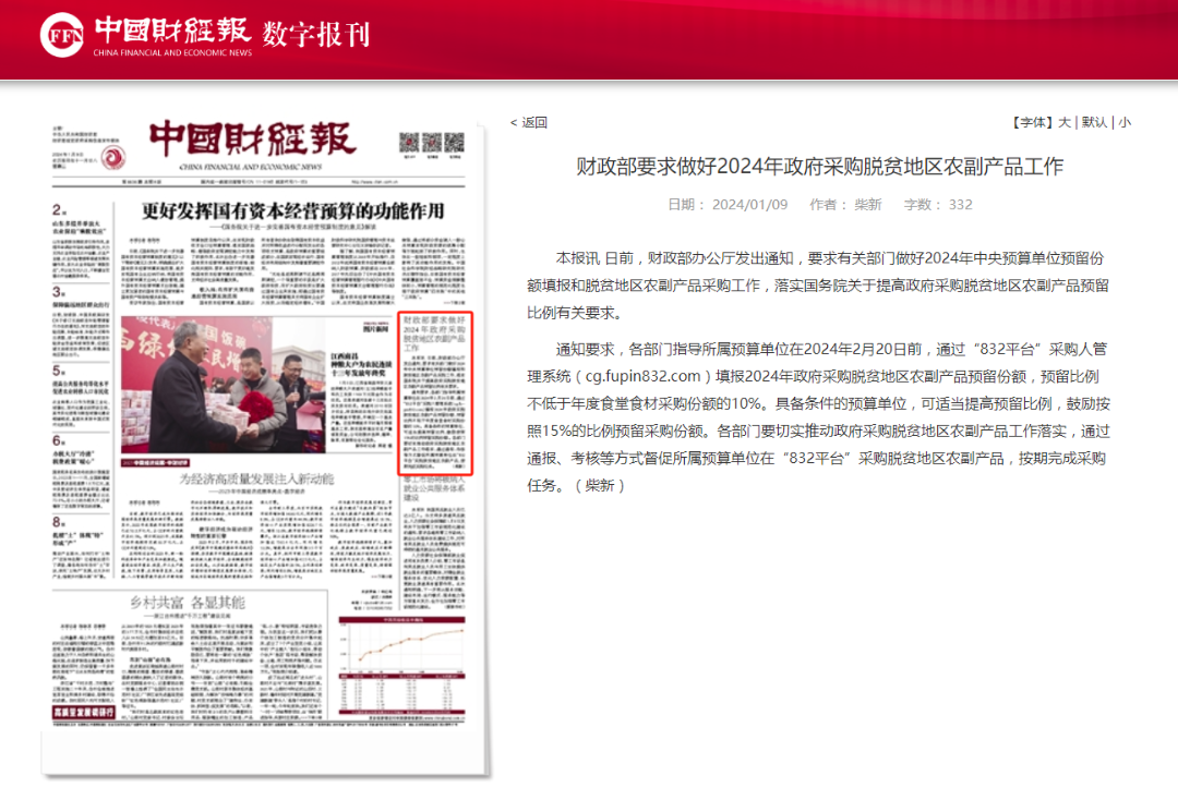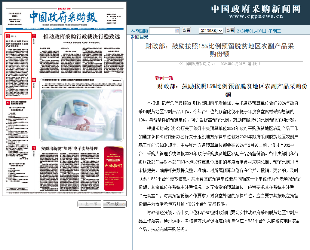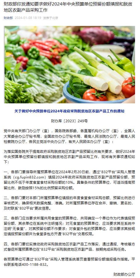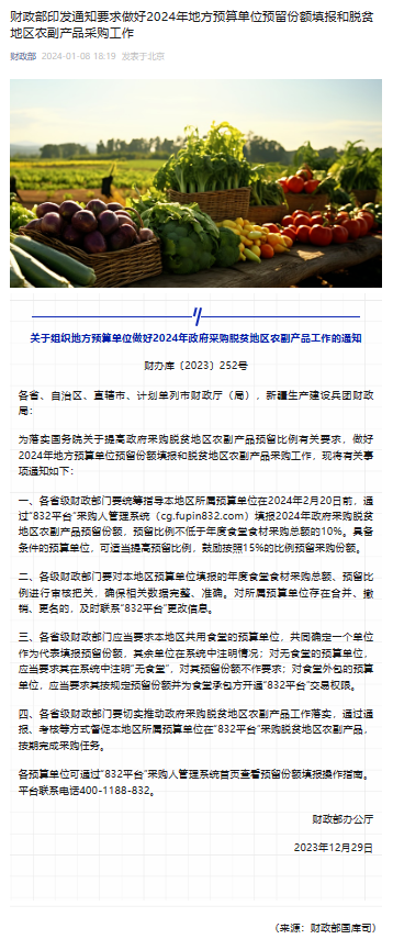 为落实国务院关于提高政府采购脱贫地区农副产品预留比例有关要求,做好2024年中央、地方预算单位预留份额填报和脱贫地区农副产品采购工作,财政部办公厅日前印发《财政部办公厅关于做好中央预算单位2024年政府采购脱贫地区农副产品工作的通知》(财办库〔2023〕249号)、《财政部办公厅关于组织地方预算单位做好2024年政府采购脱贫地区农副产品工作的通知》(财办库〔2023〕252号)。