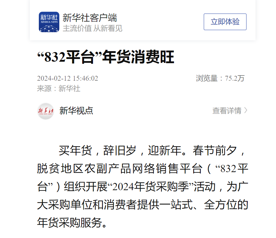 买年货,辞旧岁,迎新年。春节前夕,脱贫地区农副产品网络销售平台(“832平台”)组织开展“2024年货采购季”活动,为广大采购单位和消费者提供一站式、全方位的年货采购服务。