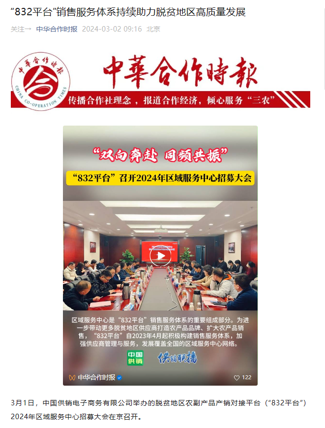 “近日,中华合作时报报道,“832平台”2024年区域服务中心招募大会成功在京召开,会上对“832平台”销售服务体系持续助力脱贫地区高质量发展进行介绍。”